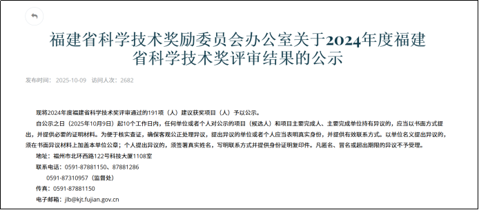 10月9日,福建省科学技术奖励委员会办公室公示了2024年度福建省科学技术奖评审结果。福州大学建筑与城乡规划学院王文奎老师参与的项目成果获二等奖...