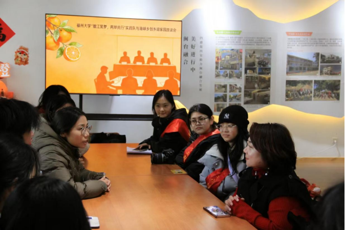 实践队邀请到乡建乡创专家、福建省五一劳动奖章获得者、台青曾芝颖老师与两岸学子开展座谈交流。曾芝颖结合自身长期参与福建乡村建设的实践经验,分享了“以人为本、尊重在地”的乡建设计理念。她说:“设计一定要尊重在地文化,让人住得安心、用得舒服。”交流中,两岸学子围绕乡建设计理念与实践方法进行了深入探讨。
