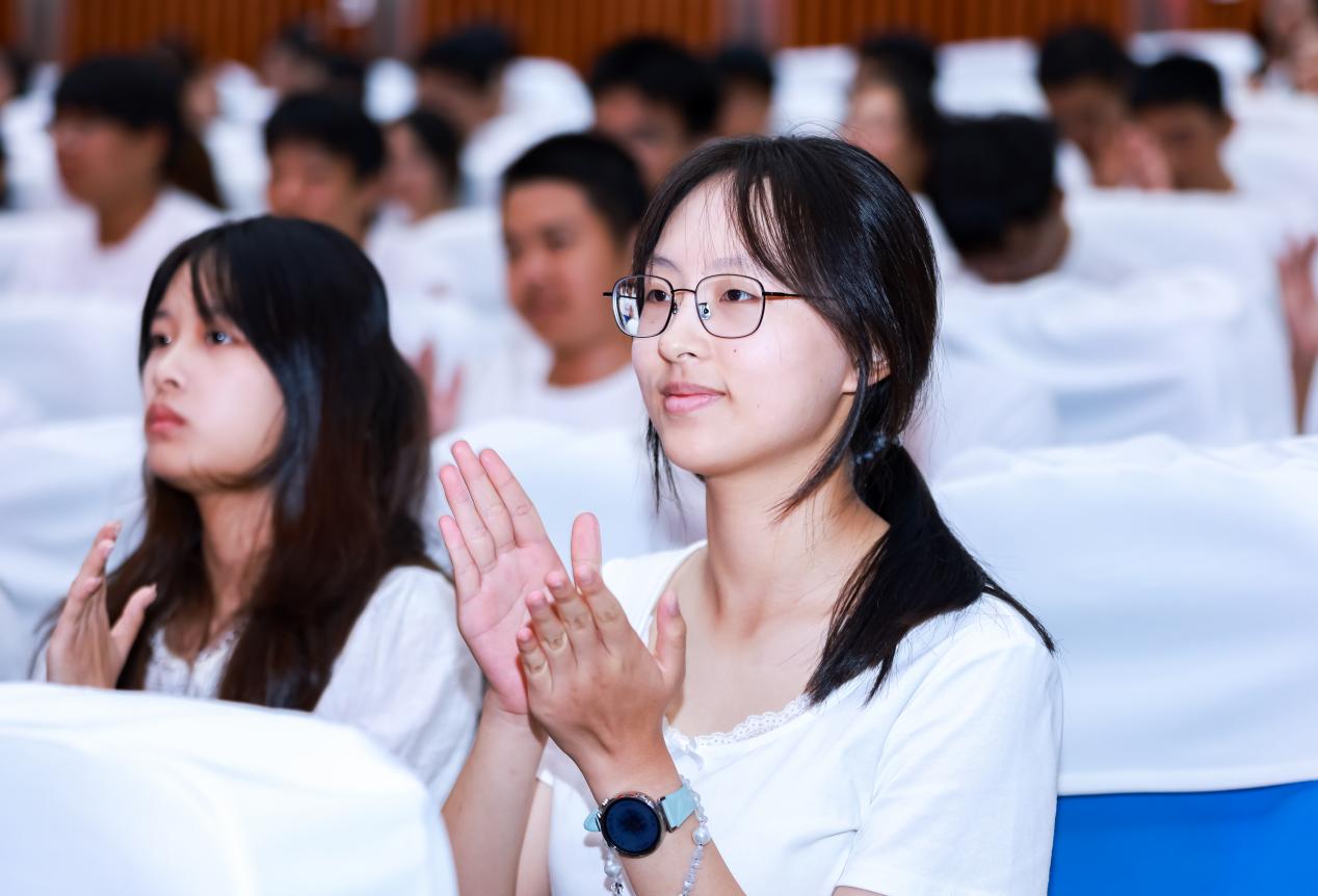 开学第一课设在博学厅。这是一处能让心静下来的地方。温润的木色透着典雅,蓝白相间的座椅如静默的云空。弧形的弯顶下,灯光宛如温柔的星子,整个空间仿佛一卷摊开的厚重典籍,等待着新的思想为其增添注脚。