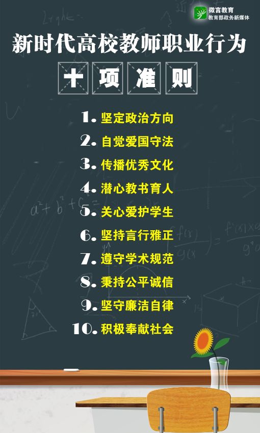 教育部印发的《新时代高校教师职业行为十项准则》,明确了新时代教师职业规范,划定基本底线,深化师德师风建设。